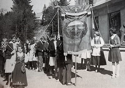 jenter som bærer duskene til Rotnes skole sin fane.
